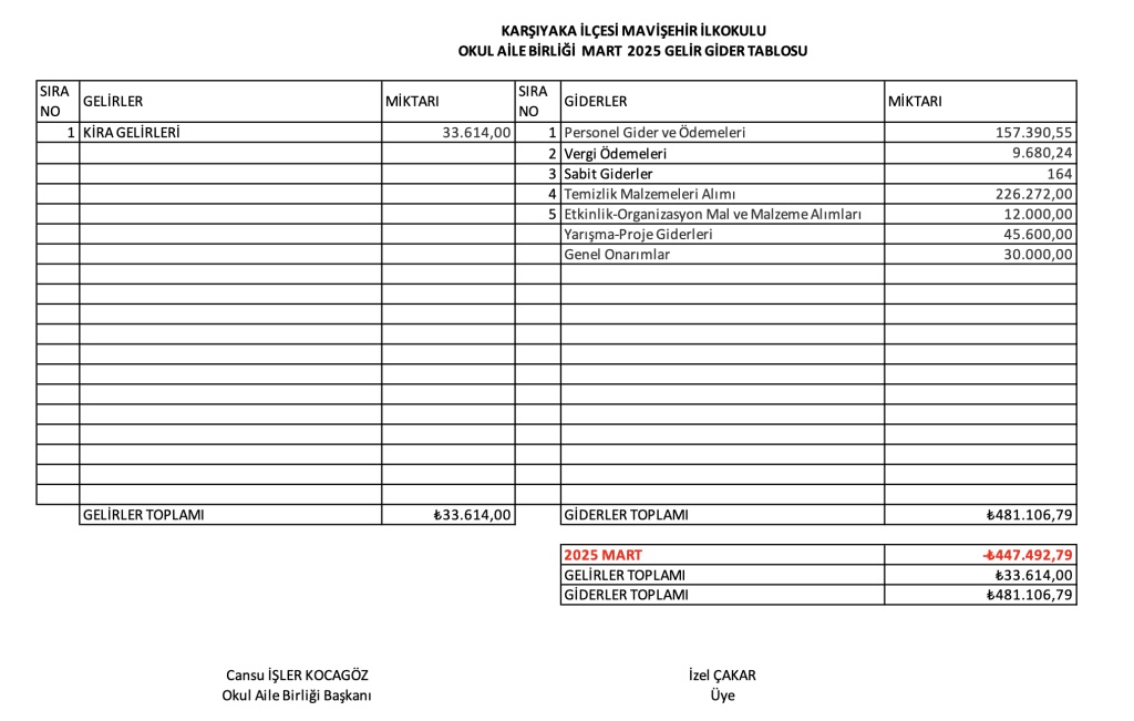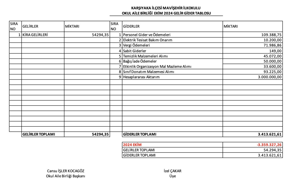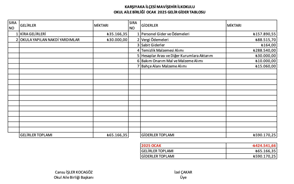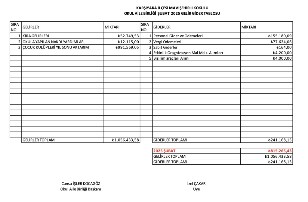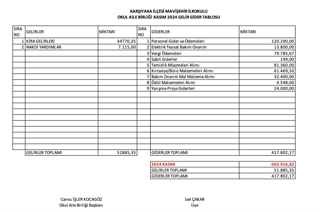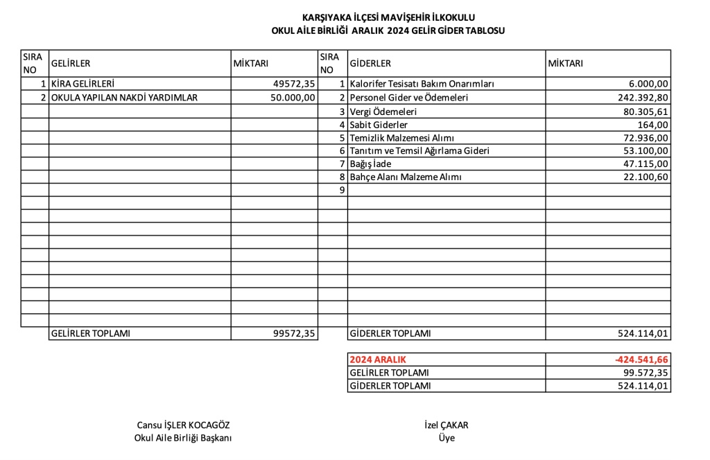 OKUL AİLE BİRLİĞİ GELİR GİDER TABLOSU